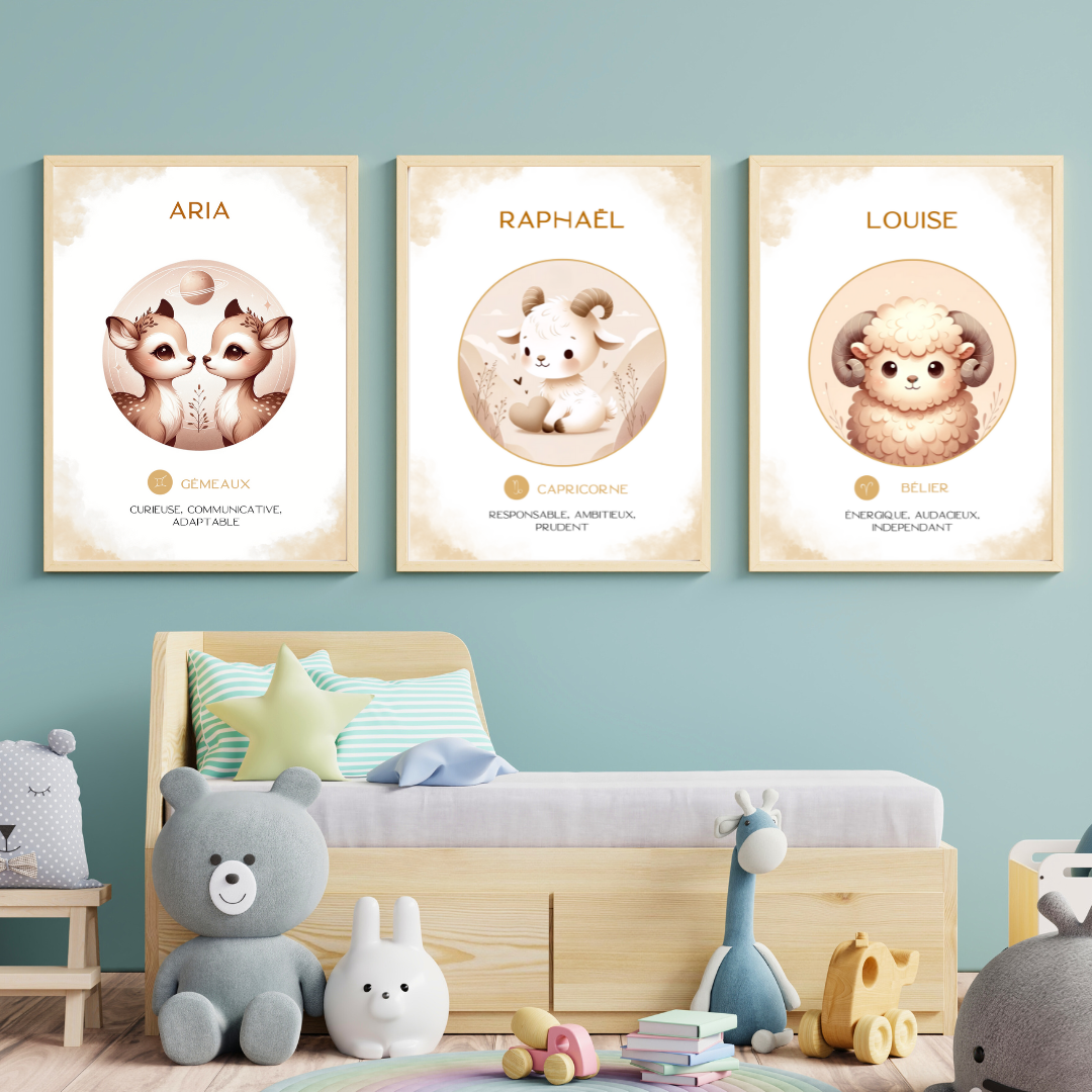 Un tableau personnalisé avec le prénom de votre enfant pour décorer sa chambre avec l'animal Totem de son signe astrologique.